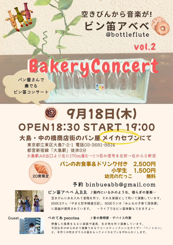 ビン笛アベベÀ.B.B.さんコンサートのゲストとして、なんと大好きなパン屋さんの「メイカセブン」にて演奏します~~~!