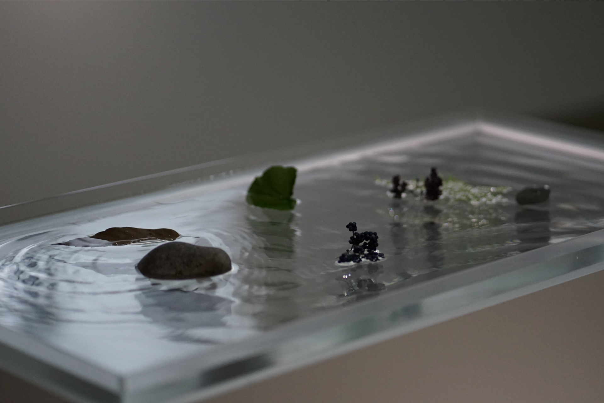水に移ろう葉や石、木のうごきのための音のしくみをサイン波とその共鳴を用いて制作しました。